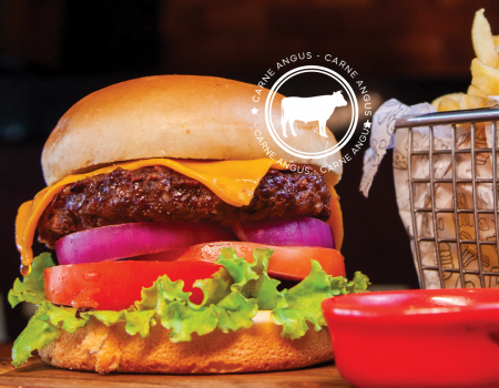 Hambúrguer Angus grelhado acompanhado de queijo, alface, tomate, cebola roxa e tempero especial no pão Brioche.