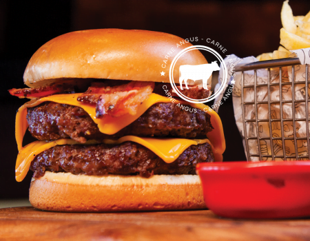 Duplo Mega Burger (150 g cada) acompanhado de fatias de bacon, queijo, tempero especial, grelhado a sua preferência.