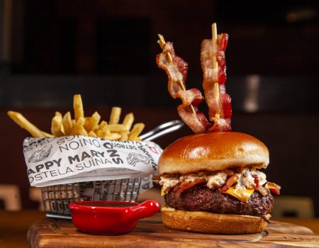 Mega Burger (150 g) acompanhado de 6 fatias de bacon, queijo, tempero especial, maionese com bacon e mais 2 espetinhos de bacon. É muuuuuuito bacon!