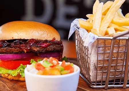 100% Sabor, 0% beef. Hambúrguer vegano (150 g) no pão Brioche, acompanhado de alface, tomate e cebola caramelizada.